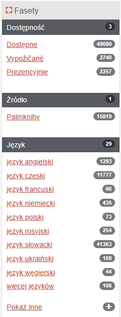 W przypadku, gdy zostanie znalezionych więcej rekordów, można ograniczyć wyniki za pomocą filtrów w prawej kolumnie katalogu online. Katalog sortuje wyniki według określonych haseł (autor, rodzaj dokumentu, słowa kluczowe, rok wydania itd.) i wyświetla liczbę odpowiadających rekordów. Jeśli zaznaczysz konkretne nazwisko autora lub inne hasło, możesz sprecyzować swoje zapytanie. Wybrane filtry ograniczające wyniki wyszukiwania są wyświetlane w prawym górnym rogu nad wszystkimi dostępnymi filtrami.