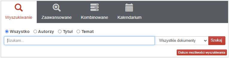 Wpisz szukane słowa w polu wejściowym i zaznacz typ danych (Autor / Tytuł / Temat).