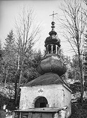 Stará Voda, kaple sv. Anny nad pramenem, celek čelně, (v boudě vpravo monolit kamenná nádrž na vodu)