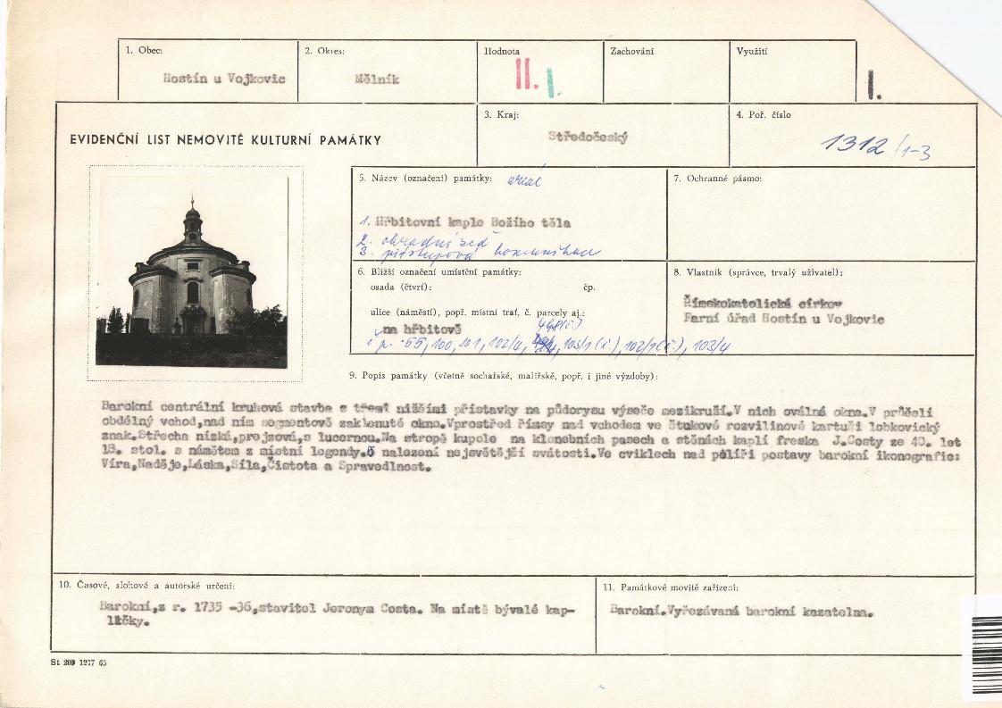 | Přír. bod: 22157 | Název objektu: kaple Božího těla | Část obce: Hostín u Vojkovic | Č. dom.: | Ulice: | Č. or.: | Kat. území: Hostín u Vojkovic | Obec: Hostín u Vojkovic | ORP: Kralupy nad Vltavou | Okres: Mělník |