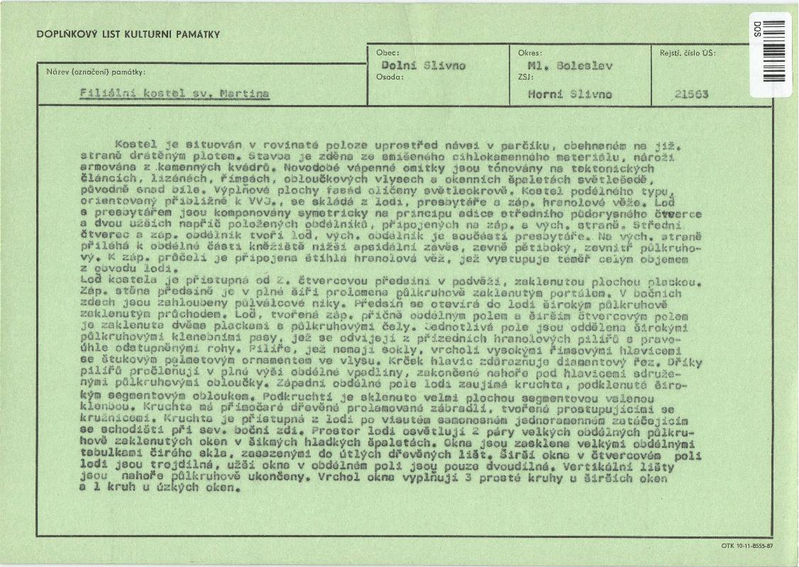| Přír. bod: 19376 | Název objektu: kostel sv. Martina | Část obce: Horní Slivno | Č. dom.: | Ulice: | Č. or.: | Kat. území: Horní Slivno | Obec: Horní Slivno | ORP: Mladá Boleslav | Okres: Mladá Boleslav |