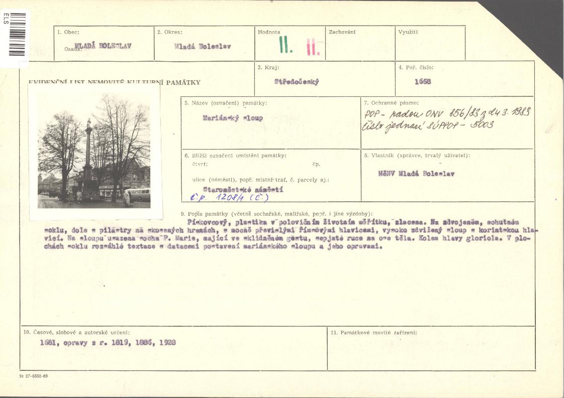 | Přír. bod: 18309 | Název objektu: sloup se sochou Panny Marie | Část obce: Mladá Boleslav I | Č. dom.: | Ulice: Staroměstské náměstí | Č. or.: | Kat. území: Mladá Boleslav | Obec: Mladá Boleslav | ORP: Mladá Boleslav | Okres: Mladá Boleslav |