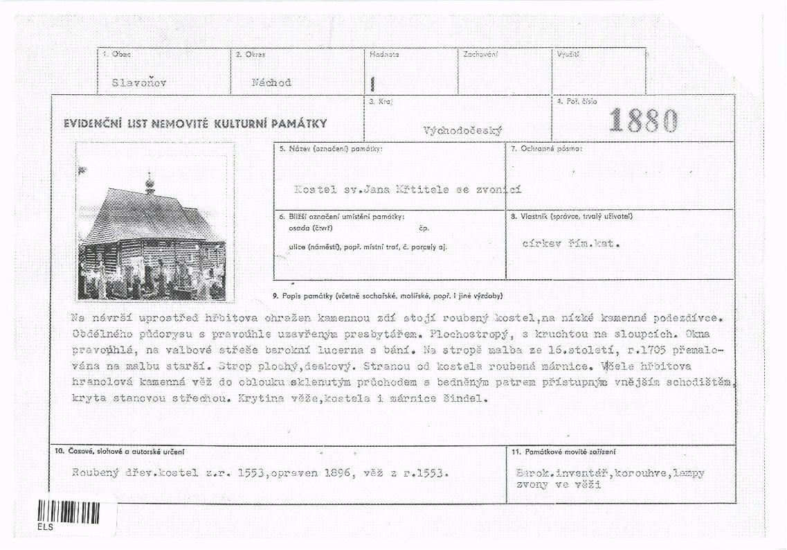 | Def. bod: 2552481 | Název objektu: kostel sv. Jana Křtitele | Část obce: Slavoňov | Č. dom.: | Ulice: | Č. or.: | Kat. území: Slavoňov | Obec: Slavoňov | ORP: Nové Město nad Metují | Okres: Náchod |