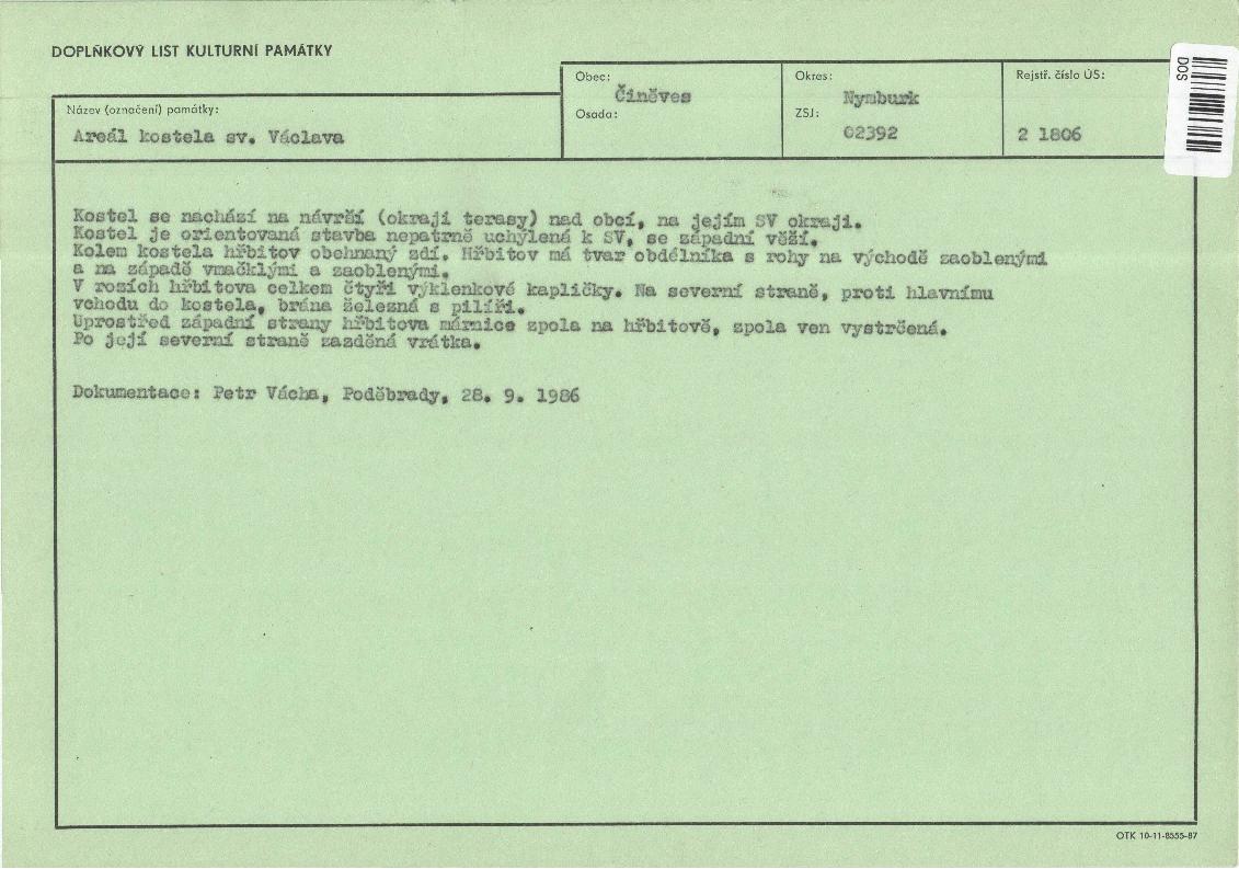 | Přír. bod: 16265 | Název objektu: kostel sv. Václava | Část obce: Činěves | Č. dom.: | Ulice: | Č. or.: | Kat. území: Činěves | Obec: Činěves | ORP: Poděbrady | Okres: Nymburk |
