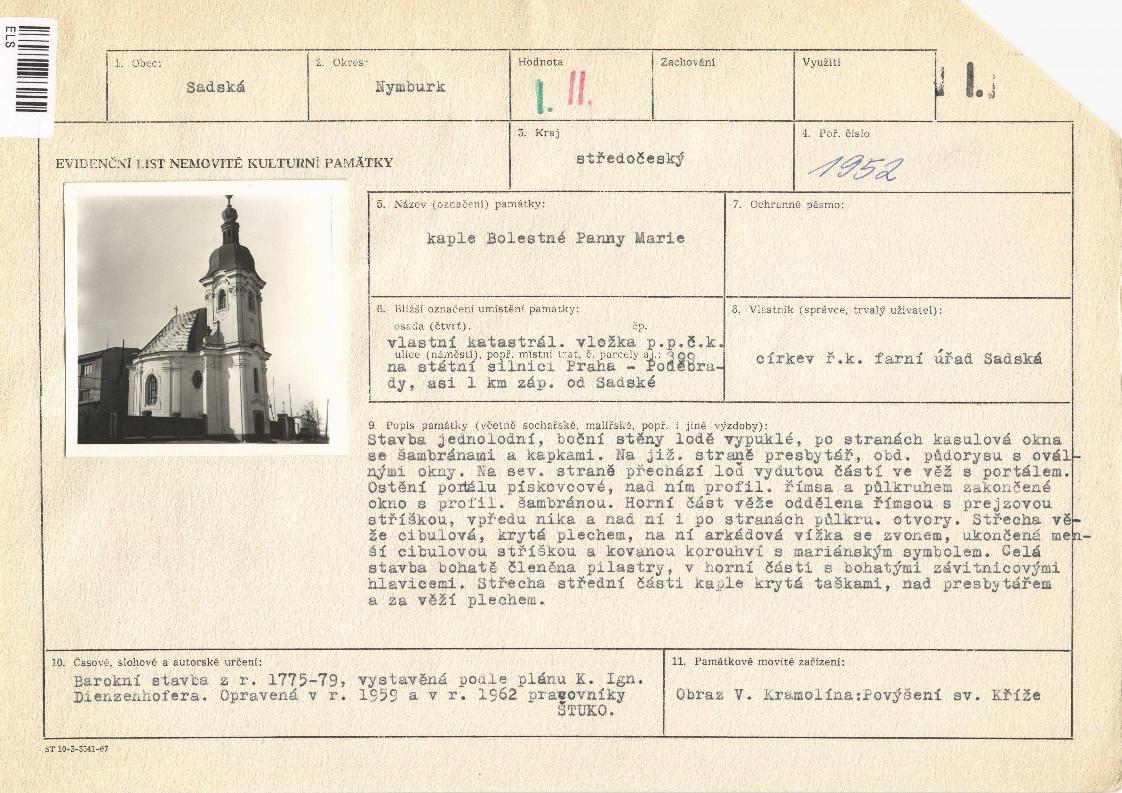 | Def. bod: 2557583 | Název objektu: kaple Bolestné Panny Marie | Část obce: Sadská | Č. dom.: | Ulice: Pražská | Č. or.: | Kat. území: Sadská | Obec: Sadská | ORP: Nymburk | Okres: Nymburk |
