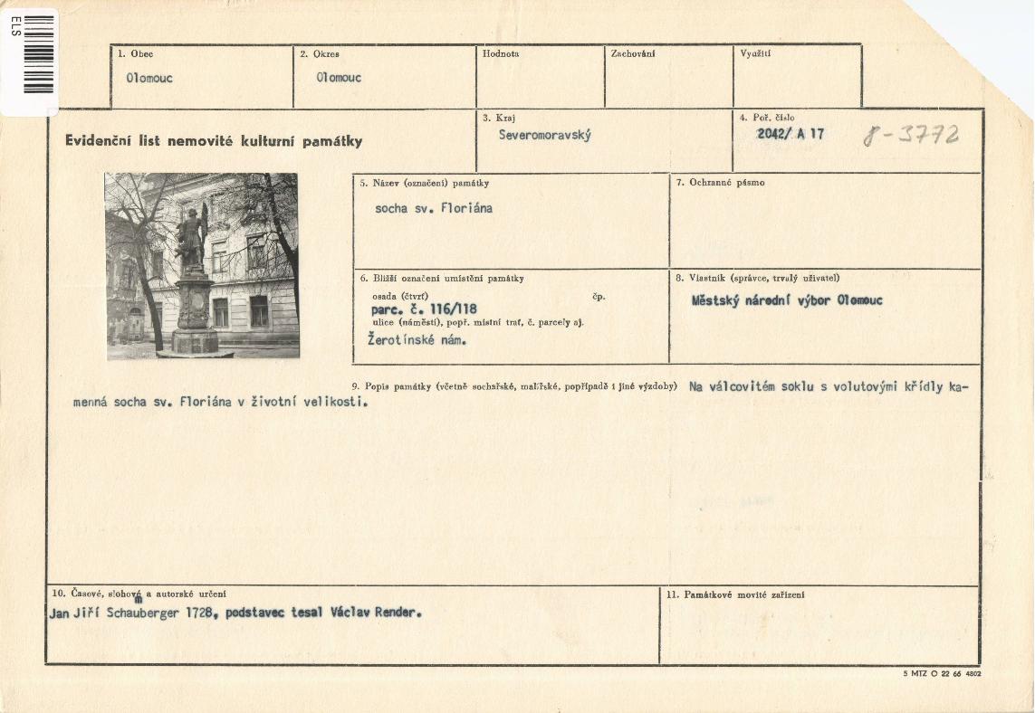 | Def. bod: 2554772 | Název objektu: socha sv. Floriána | Část obce: Olomouc | Č. dom.: | Ulice: Žerotínovo nám. | Č. or.: | Kat. území: Olomouc-město | Obec: Olomouc | ORP: Olomouc | Okres: Olomouc |