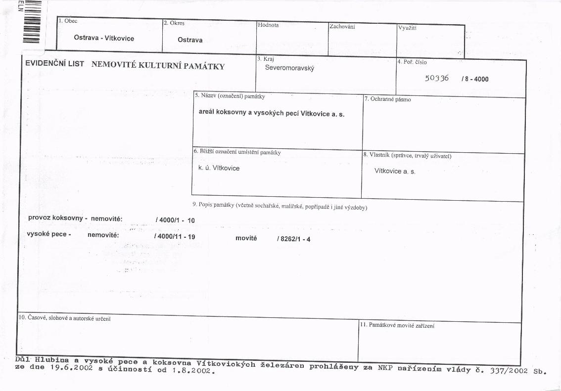 | Přír. bod: 67175 | Název objektu: vysoká pec č. 1 | Část obce: Vítkovice | Č. dom.: | Ulice: | Č. or.: | Kat. území: Vítkovice | Obec: Ostrava | ORP: Ostrava | Okres: Ostrava-město |