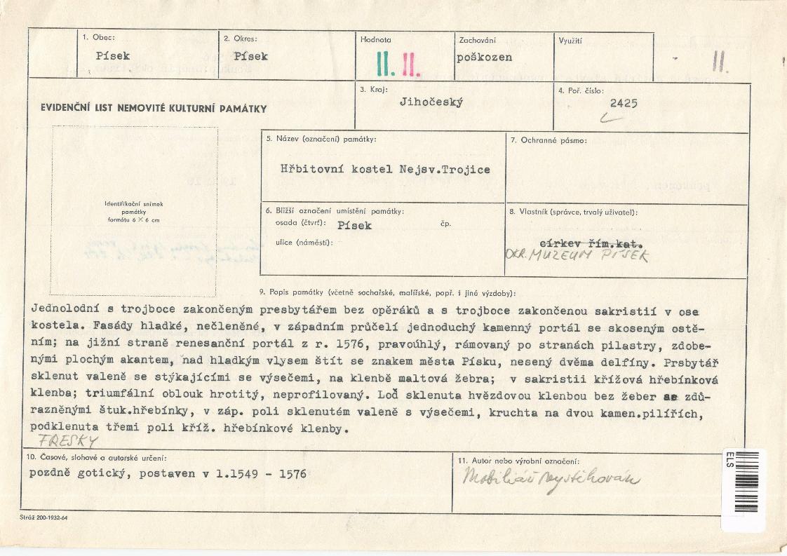 | Def. bod: 2559186 | Název objektu: kostel Nejsvětější Trojice | Část obce: Pražské Předměstí | Č. dom.: | Ulice: | Č. or.: | Kat. území: Písek | Obec: Písek | ORP: Písek | Okres: Písek |