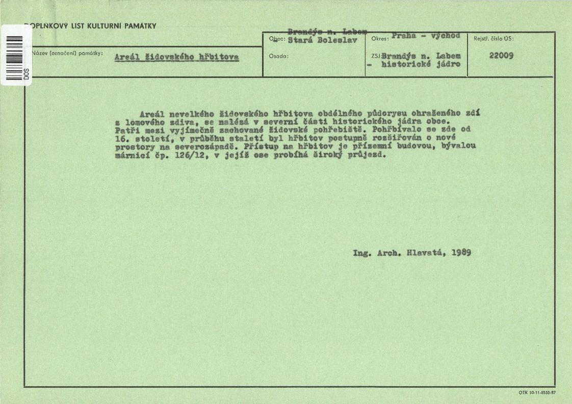 | Přír. bod: 19943 | Název objektu: židovský hřbitov s náhrobními kameny | Část obce: Brandýs nad Labem | Č. dom.: | Ulice: | Č. or.: | Kat. území: Brandýs nad Labem | Obec: Brandýs nad Labem-Stará Boleslav | ORP: Brandýs nad Labem-Stará Boleslav | Okres: Praha-východ |