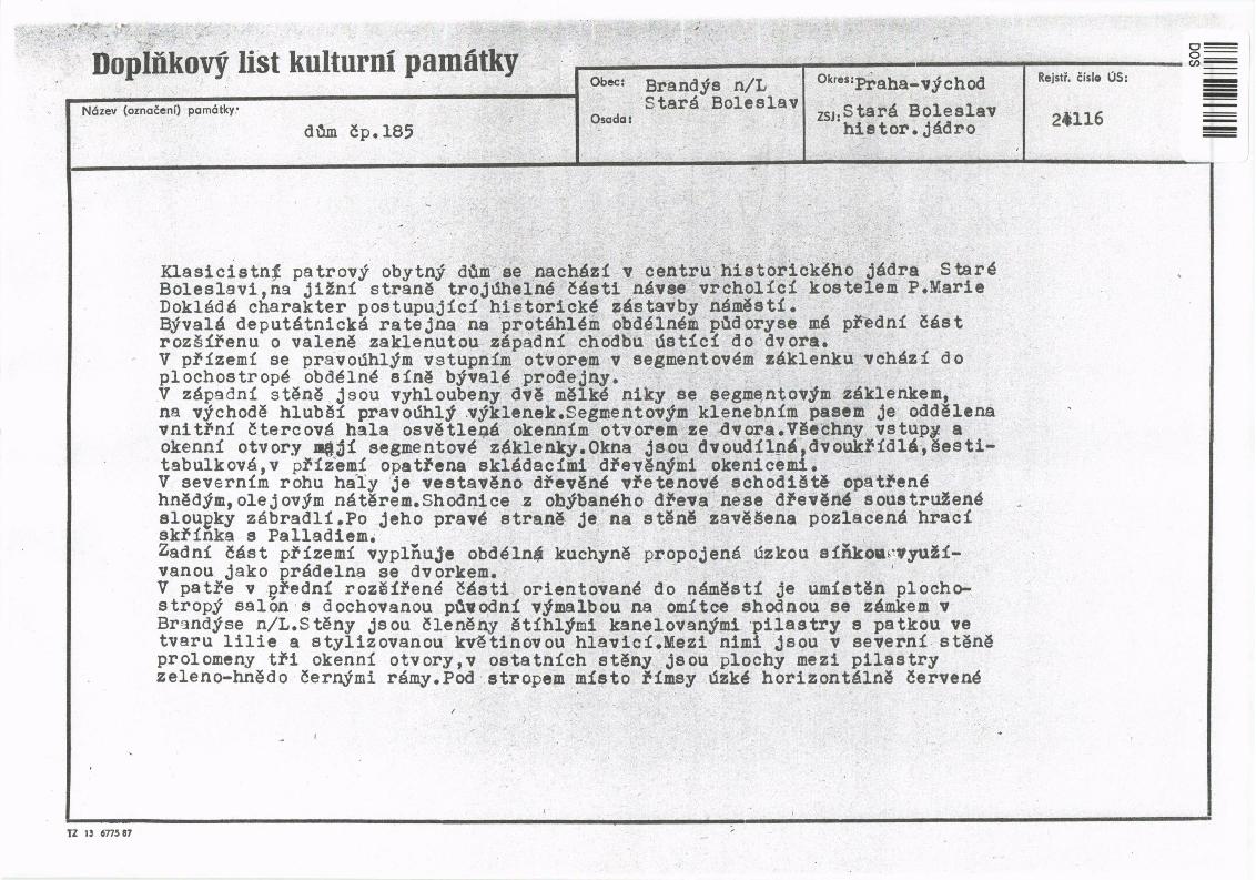 | Přír. bod: 99537 | Název objektu: městský dům | Část obce: Stará Boleslav | Č. dom.: č.p. 185 | Ulice: Mariánské náměstí | Č. or.: | Kat. území: Stará Boleslav | Obec: Brandýs nad Labem-Stará Boleslav | ORP: Brandýs nad Labem-Stará Boleslav | Okres: Praha-východ |