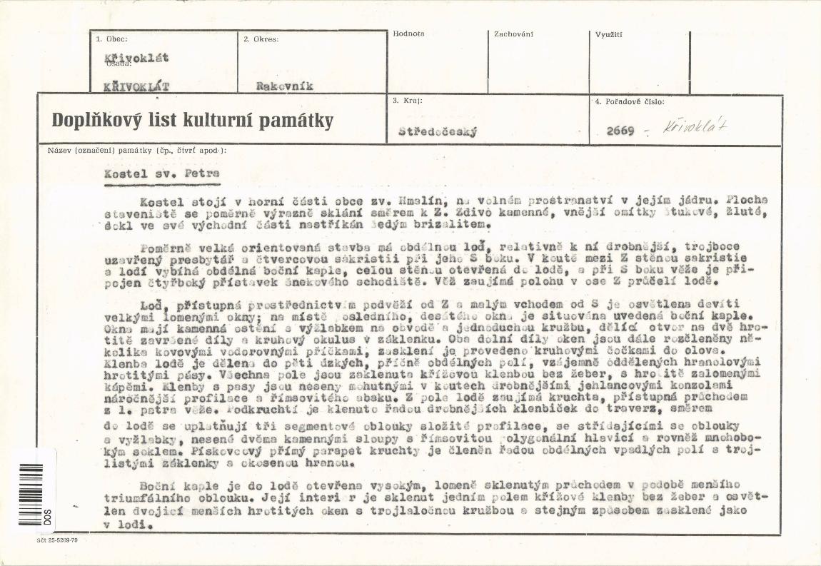 Def. bod: 2555580 | Název objektu: kostel sv. Petra | Část obce: Křivoklát | Č. dom.: | Ulice: | Č. or.: | Kat. území: Křivoklát | Obec: Křivoklát | ORP: Rakovník | Okres: Rakovník |