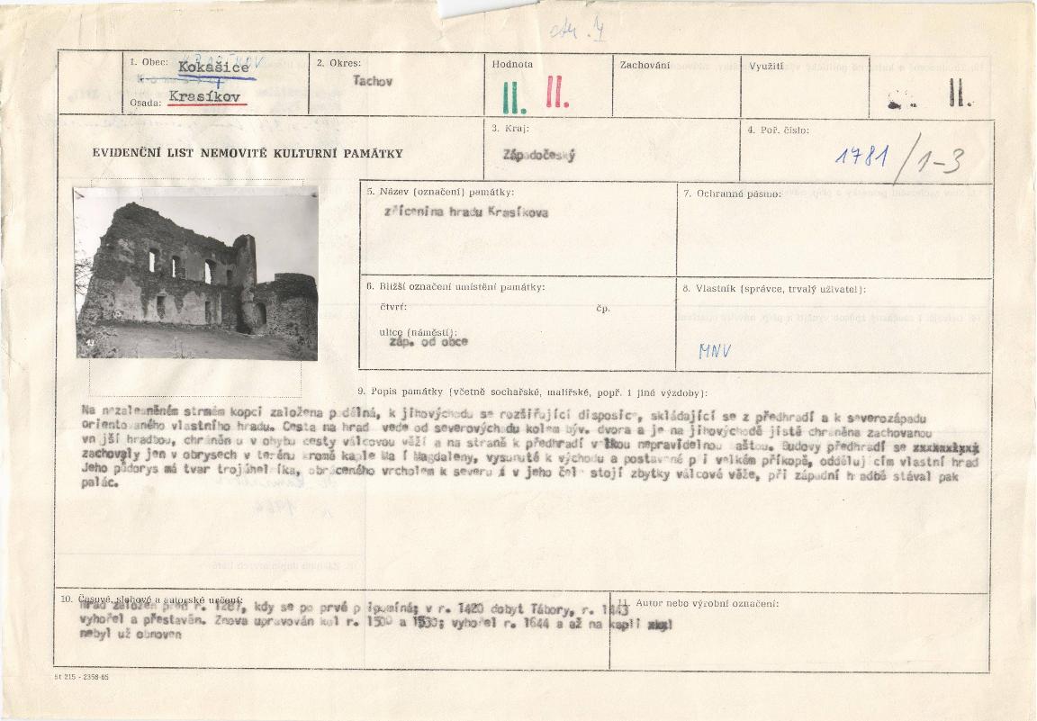| Přír. bod: 35250 | Název objektu: zřícenina hradu Krasíkov (Švamberk) | Část obce: Krasíkov | Č. dom.: | Ulice: | Č. or.: | Kat. území: Kokašice | Obec: Kokašice | ORP: Stříbro | Okres: Tachov |