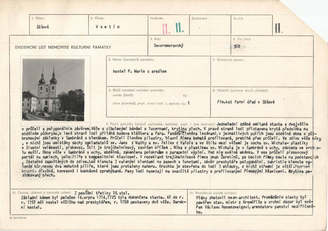 | Def. bod: 2554446 | Název objektu: kostel Navštívení Panny Marie | Část obce: Zašová | Č. dom.: | Ulice: | Č. or.: | Kat. území: Zašová | Obec: Zašová | ORP: Valašské Meziříčí | Okres: Vsetín |