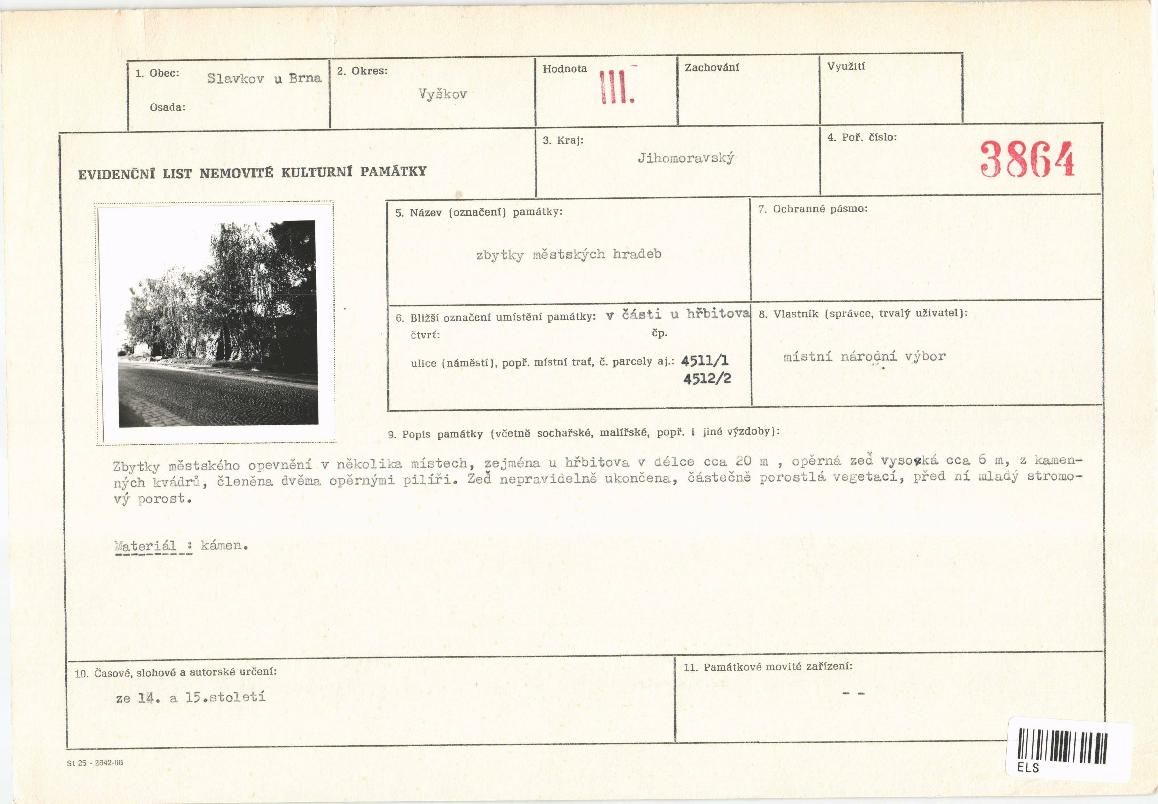 | Def. bod: 2456659 | Název objektu: hradby | Část obce: Slavkov u Brna | Č. dom.: | Ulice: | Č. or.: | Kat. území: Slavkov u Brna | Obec: Slavkov u Brna | ORP: Slavkov u Brna | Okres: Vyškov |