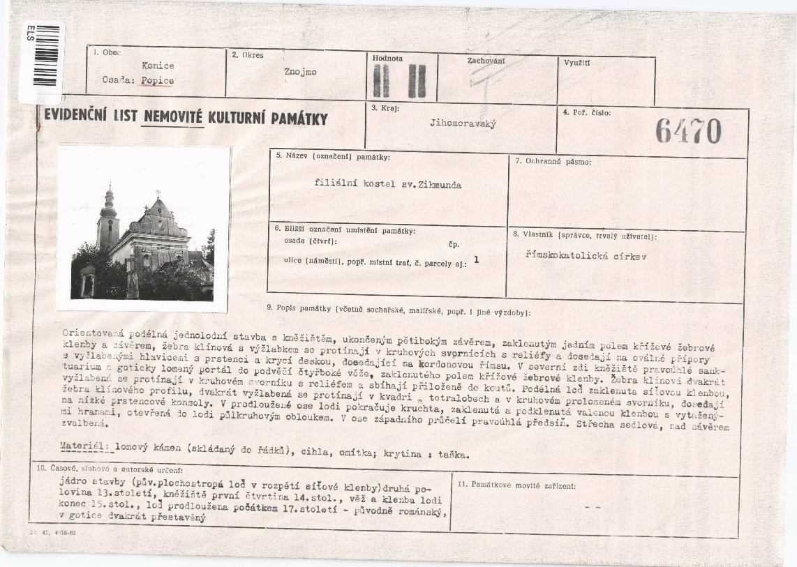 | Def. bod: 2457003 | Název objektu: kostel sv. Zikmunda | Část obce: Popice | Č. dom.: | Ulice: | Č. or.: | Kat. území: Popice u Znojma | Obec: Znojmo | ORP: Znojmo | Okres: Znojmo |