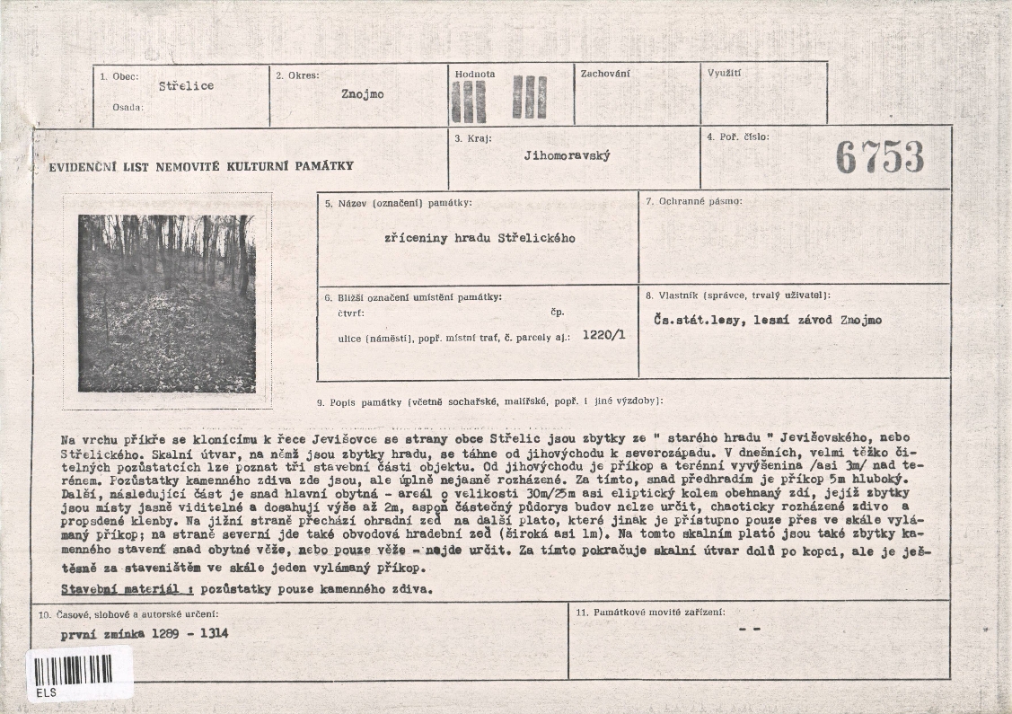 | Přír. bod: 12292 | Název objektu: hrad Jevišovice | Část obce: Střelice | Č. dom.: | Ulice: | Č. or.: | Kat. území: Střelice u Jevišovic | Obec: Střelice | ORP: Znojmo | Okres: Znojmo |