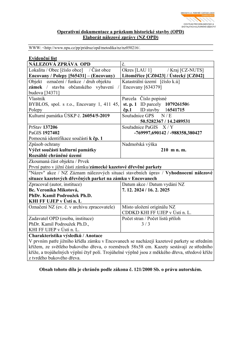 | Def. bod: 1927402 | Název objektu: | Část obce: Encovany | Č. dom.: č.p. 1 | Ulice: | Č. or.: | Kat. území: Encovany | Obec: Polepy | ORP: Litoměřice | Okres: Litoměřice |