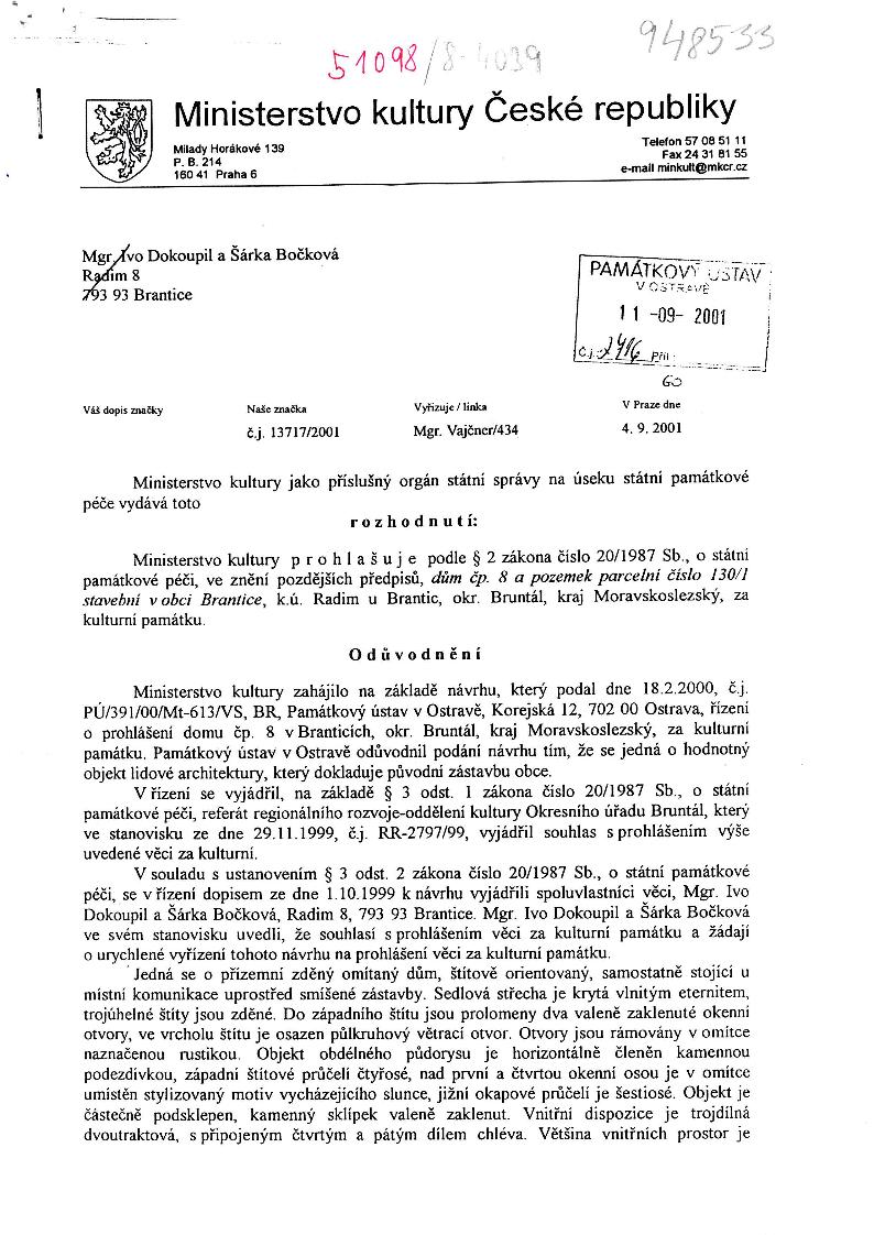 | Def. bod: 1437770 | Název objektu: | Část obce: Radim | Č. dom.: č.p. 8 | Ulice: | Č. or.: | Kat. území: Radim u Brantic | Obec: Brantice | ORP: Krnov | Okres: Bruntál |