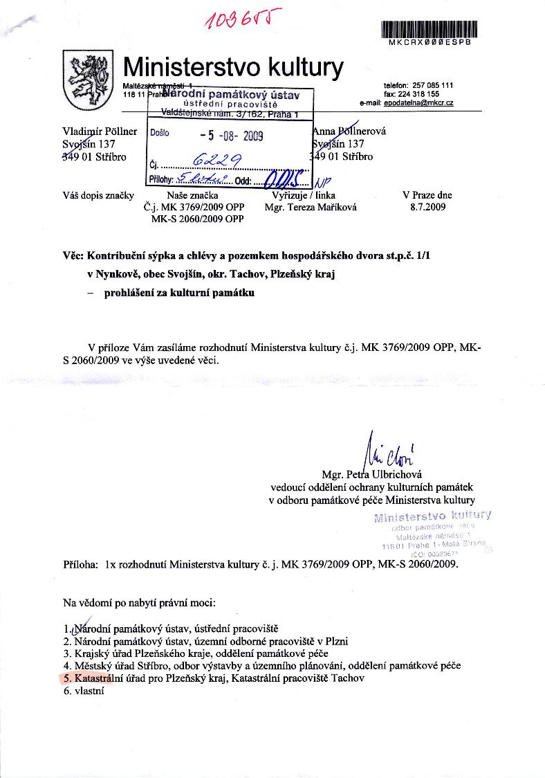 | Def. bod: 1600917 | Název objektu: | Část obce: Nynkov | Č. dom.: č.ev. 2 | Ulice: | Č. or.: | Kat. území: Nynkov | Obec: Svojšín | ORP: Stříbro | Okres: Tachov |