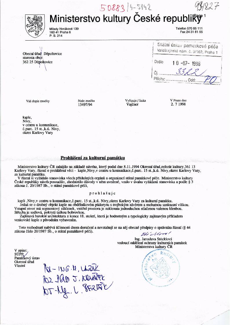 | Přír. bod: 35191 | Název objektu: kaple | Část obce: Nivy | Č. dom.: | Ulice: | Č. or.: | Kat. území: Nivy | Obec: Děpoltovice | ORP: Karlovy Vary | Okres: Karlovy Vary |