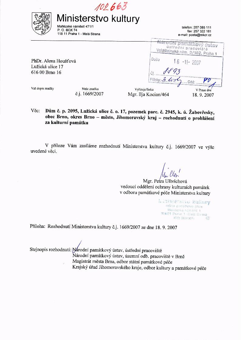 | Def. bod: 1086307 | Název objektu: | Část obce: Žabovřesky | Č. dom.: č.p. 2095 | Ulice: Lužická | Č. or.: 17 | Kat. území: Žabovřesky | Obec: Brno | ORP: Brno | Okres: Brno-město |