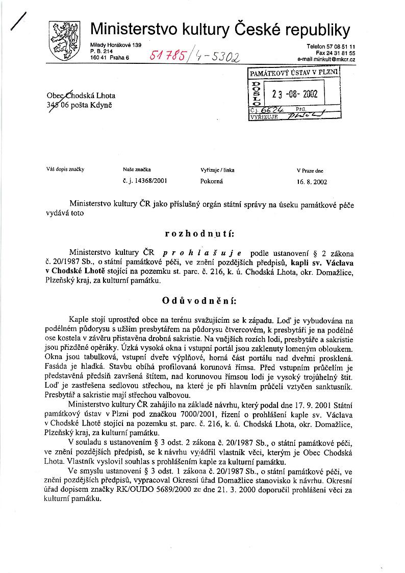 | Přír. bod: 35153 | Název objektu: kaple sv. Václava | Část obce: Chodská Lhota | Č. dom.: | Ulice: | Č. or.: | Kat. území: Chodská Lhota | Obec: Chodská Lhota | ORP: Domažlice | Okres: Domažlice |