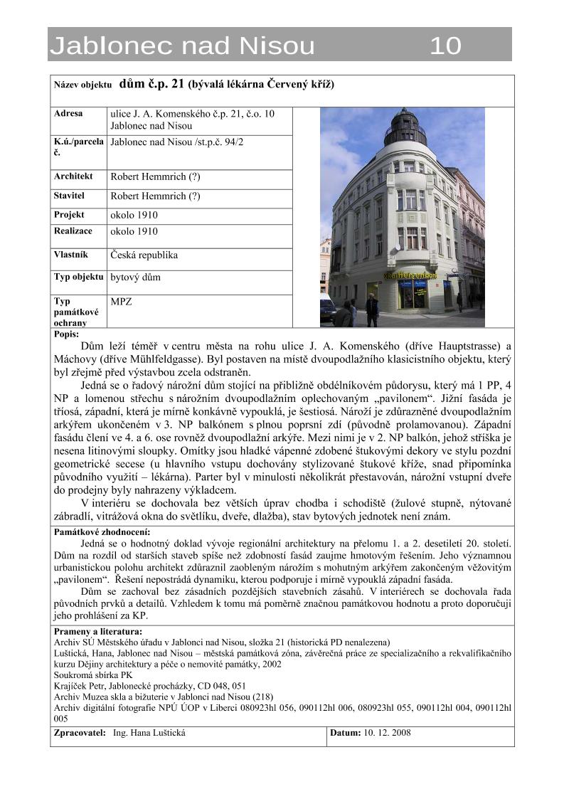 | Def. bod: 1917460 | Název objektu: | Část obce: Jablonec nad Nisou | Č. dom.: č.p. 21 | Ulice: Máchova | Č. or.: 2 | Kat. území: Jablonec nad Nisou | Obec: Jablonec nad Nisou | ORP: Jablonec nad Nisou | Okres: Jablonec nad Nisou |