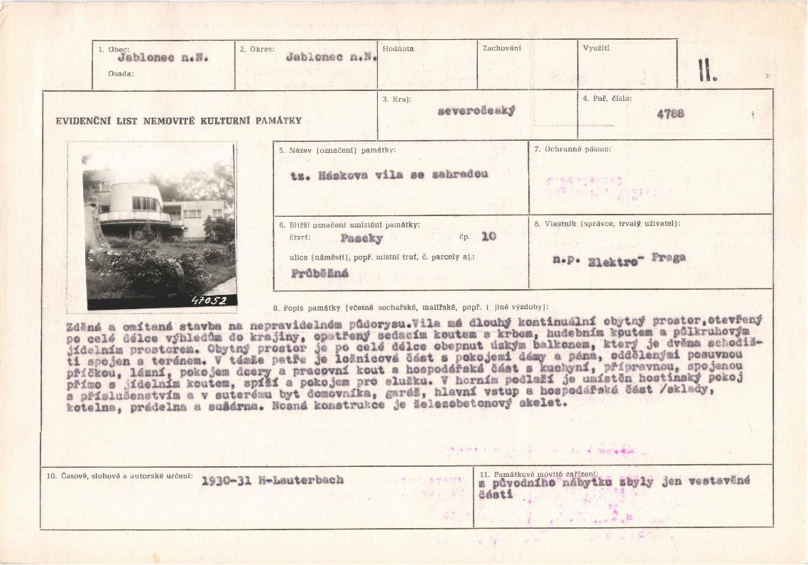 | Def. bod: 1917054 | Název objektu: Háskova vila | Část obce: Jablonecké Paseky | Č. dom.: č.p. 449 | Ulice: Průběžná | Č. or.: 10 | Kat. území: Mšeno nad Nisou | Obec: Jablonec nad Nisou | ORP: Jablonec nad Nisou | Okres: Jablonec nad Nisou |