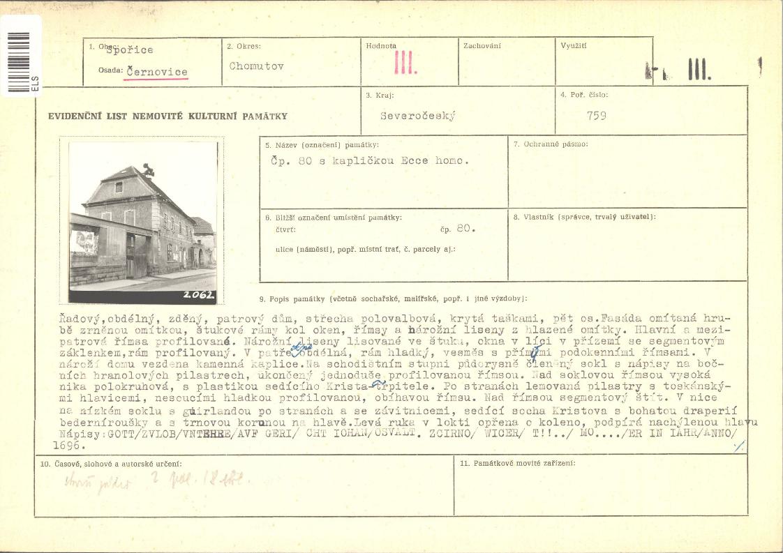 | Def. bod: 436968 | Název objektu: | Část obce: Černovice | Č. dom.: č.p. 80 | Ulice: | Č. or.: | Kat. území: Černovice u Chomutova | Obec: Černovice | ORP: Chomutov | Okres: Chomutov |