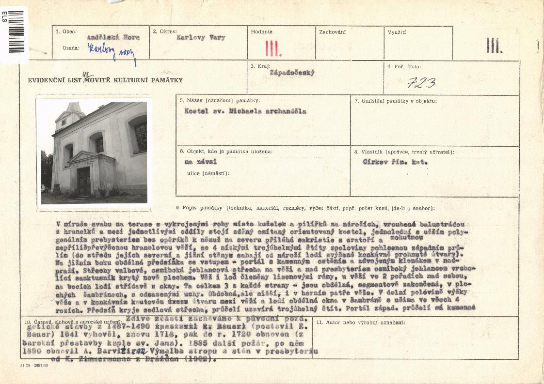 | Def. bod: 2555581 | Název objektu: kostel Archanděla Michaela | Část obce: Andělská Hora | Č. dom.: | Ulice: | Č. or.: | Kat. území: Andělská Hora | Obec: Andělská Hora | ORP: Karlovy Vary | Okres: Karlovy Vary |