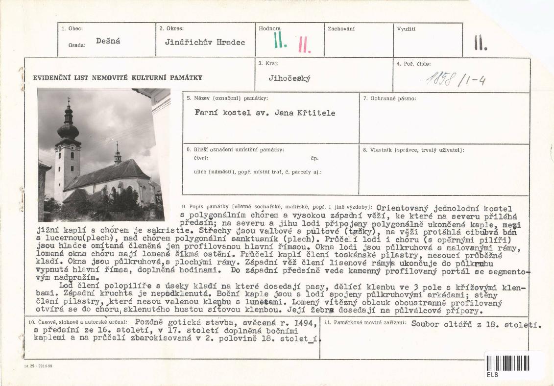 | Přír. bod: 75732 | Název objektu: kostel sv. Jana Křtitele | Část obce: Dešná | Č. dom.: | Ulice: | Č. or.: | Kat. území: Dešná u Dačic | Obec: Dešná | ORP: Dačice | Okres: Jindřichův Hradec |