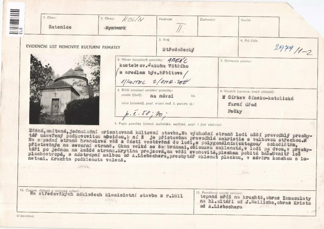 | Přír. bod: 17872 | Název objektu: kostel sv. Jakuba Většího | Část obce: Ratenice | Č. dom.: | Ulice: | Č. or.: | Kat. území: Ratenice | Obec: Ratenice | ORP: Kolín | Okres: Kolín |