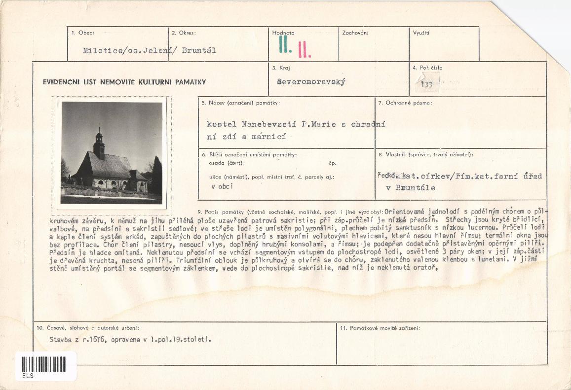 | Přír. bod: 2027 | Název objektu: kostel Nanebevzetí P. Marie | Část obce: Milotice nad Opavou | Č. dom.: | Ulice: | Č. or.: | Kat. území: Jelení u Bruntálu | Obec: Milotice nad Opavou | ORP: Bruntál | Okres: Bruntál |