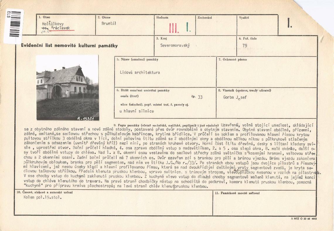 | Přír. bod: 1847 | Název objektu: dům | Část obce: Vraclávek | Č. dom.: č.p. 7 | Ulice: | Č. or.: | Kat. území: Vraclávek | Obec: Hošťálkovy | ORP: Krnov | Okres: Bruntál |