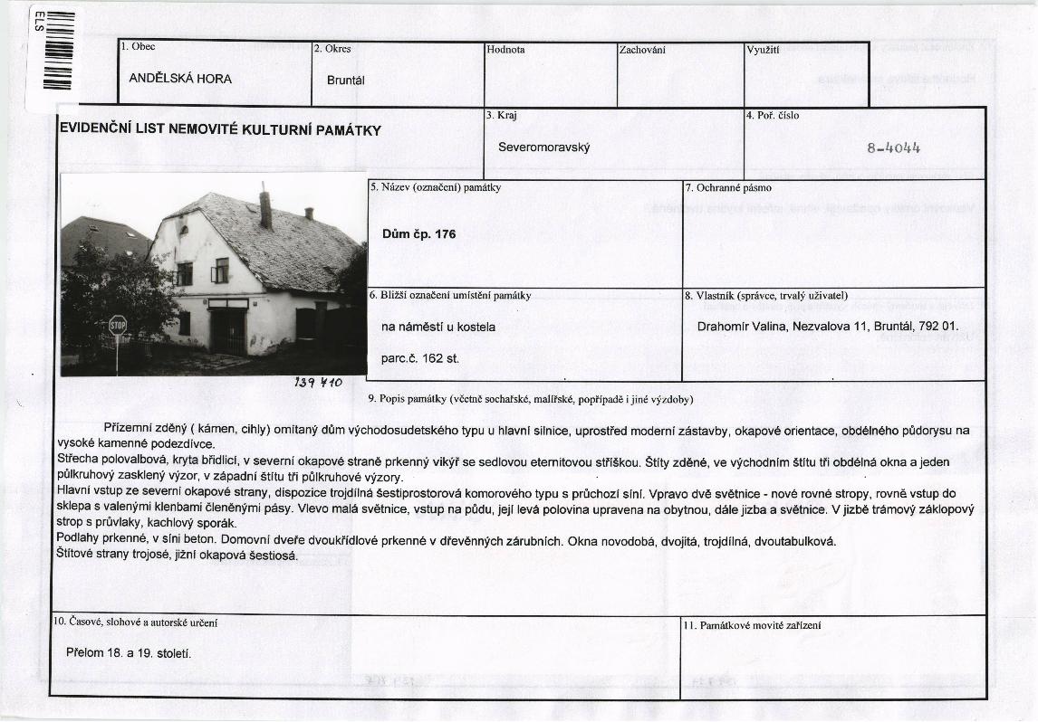 | Def. bod: 574594 | Název objektu: | Část obce: Andělská Hora | Č. dom.: č.p. 176 | Ulice: | Č. or.: | Kat. území: Andělská Hora ve Slezsku | Obec: Andělská Hora | ORP: Bruntál | Okres: Bruntál |