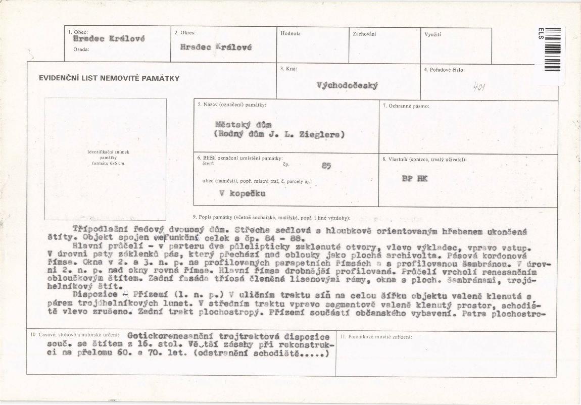 | Def. bod: 1049792 | Název objektu: rodný dům J. L. Zieglera | Část obce: Hradec Králové | Č. dom.: č.p. 85 | Ulice: V Kopečku | Č. or.: 9 | Kat. území: Hradec Králové | Obec: Hradec Králové | ORP: Hradec Králové | Okres: Hradec Králové |