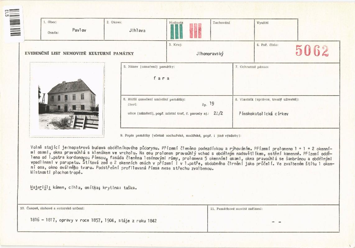 | Def. bod: 1420312 | Název objektu: | Část obce: Pavlov | Č. dom.: č.p. 19 | Ulice: | Č. or.: | Kat. území: Pavlov u Stonařova | Obec: Pavlov | ORP: Jihlava | Okres: Jihlava |