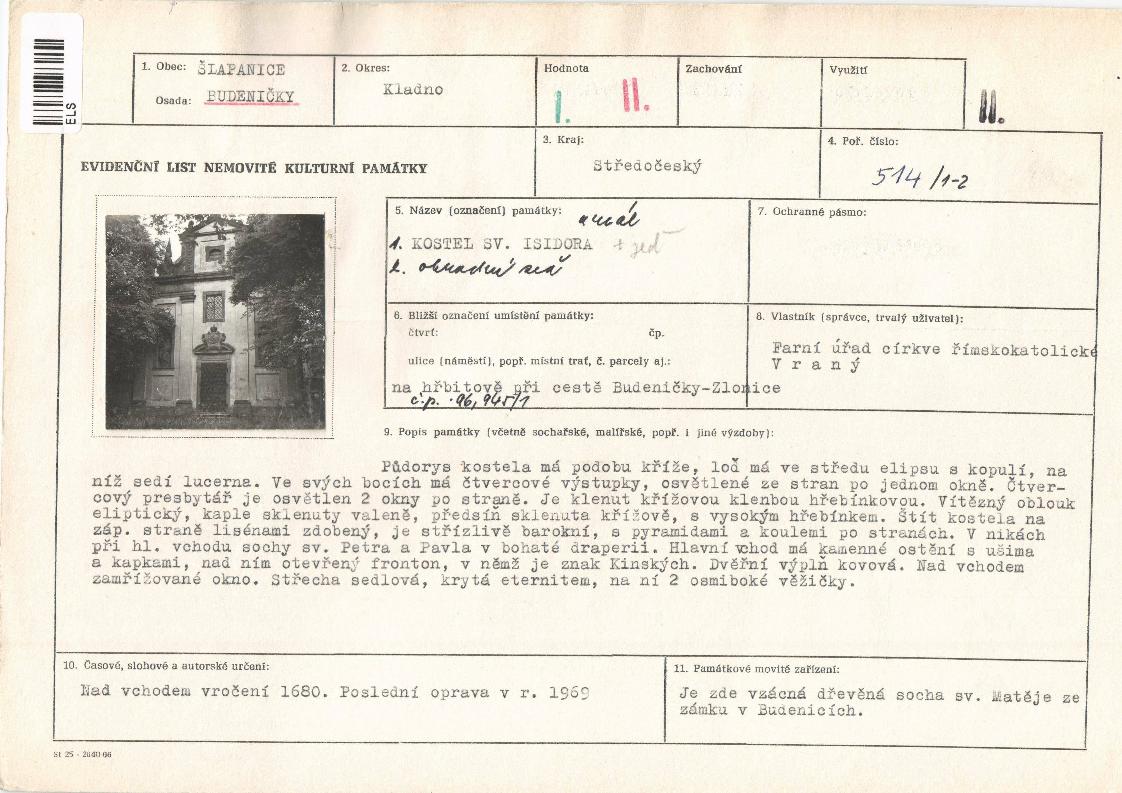 | Def. bod: 2556004 | Název objektu: kostel sv. Isidora | Část obce: Budenice | Č. dom.: | Ulice: | Č. or.: | Kat. území: Jarpice | Obec: Jarpice | ORP: Slaný | Okres: Kladno |