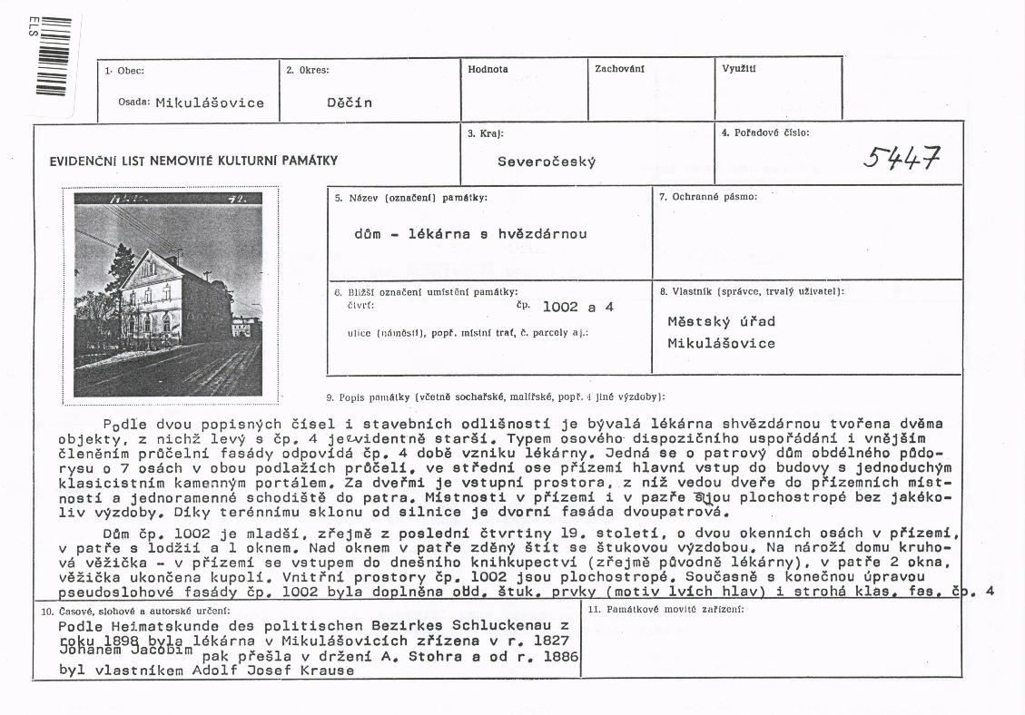 | Přír. bod: 299658 | Název objektu: dům č. p. 1002 | Část obce: Mikulášovice | Č. dom.: č.p. 1002 | Ulice: | Č. or.: | Kat. území: Mikulášovice | Obec: Mikulášovice | ORP: Rumburk | Okres: Děčín |