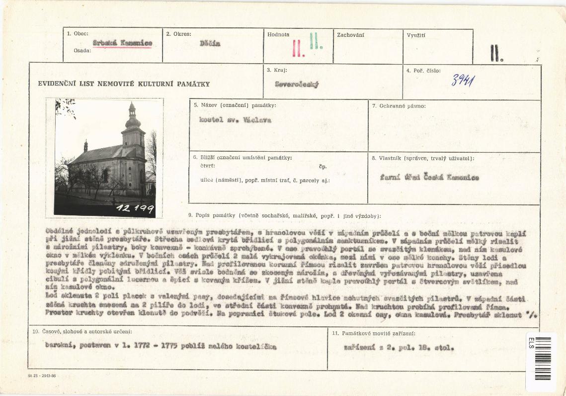 | Def. bod: 2558456 | Název objektu: kostel sv. Václava | Část obce: Srbská Kamenice | Č. dom.: | Ulice: | Č. or.: | Kat. území: Srbská Kamenice | Obec: Srbská Kamenice | ORP: Děčín | Okres: Děčín |