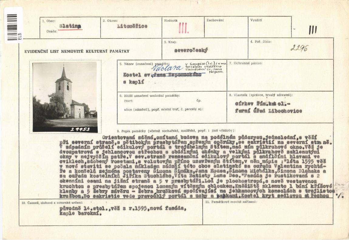 | Přír. bod: 26206 | Název objektu: kostel sv. Jana Nepomuckého | Část obce: Slatina | Č. dom.: | Ulice: | Č. or.: | Kat. území: Slatina pod Hazmburkem | Obec: Slatina | ORP: Lovosice | Okres: Litoměřice |