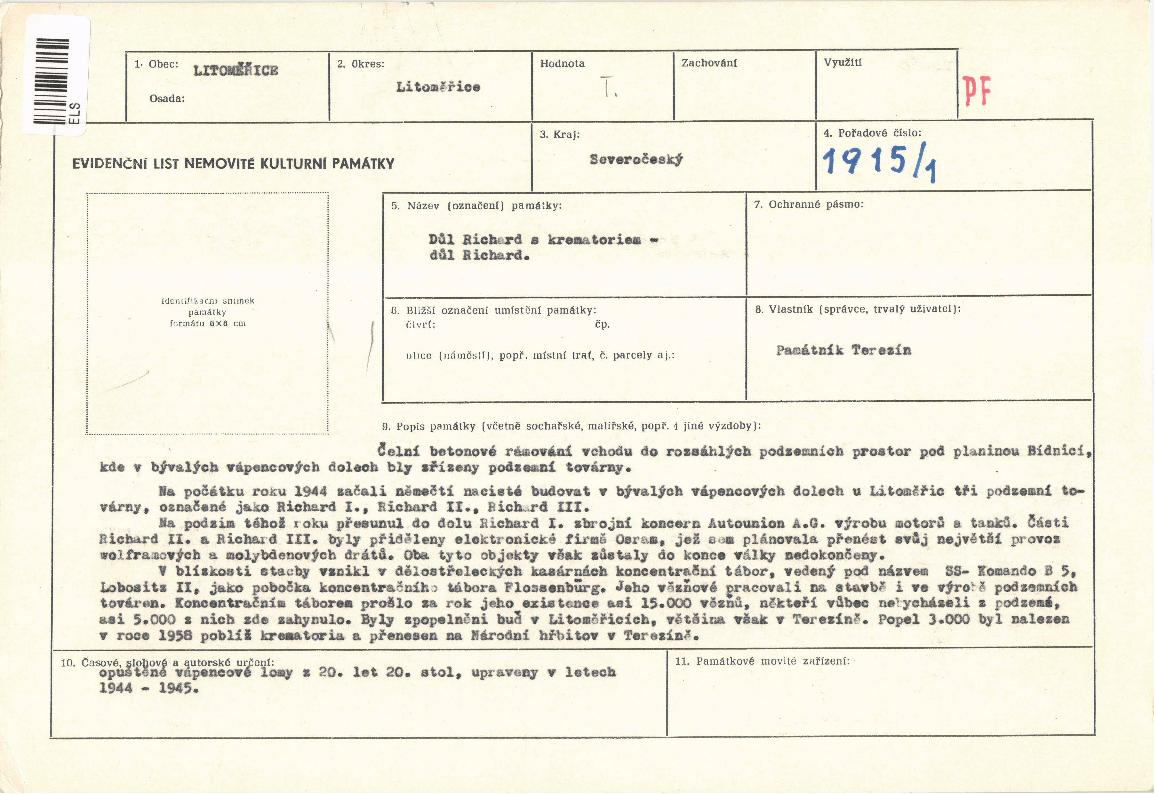 | Přír. bod: 80801 | Název objektu: bývalý důl Richard | Část obce: Předměstí | Č. dom.: | Ulice: | Č. or.: | Kat. území: Litoměřice | Obec: Litoměřice | ORP: Litoměřice | Okres: Litoměřice |