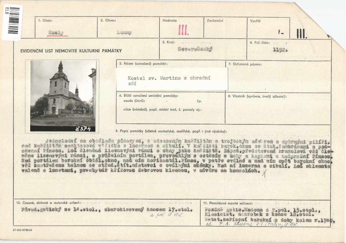 | Přír. bod: 28426 | Název objektu: kostel sv. Martina | Část obce: Kozly | Č. dom.: | Ulice: | Č. or.: | Kat. území: Kozly u Loun | Obec: Kozly | ORP: Louny | Okres: Louny |