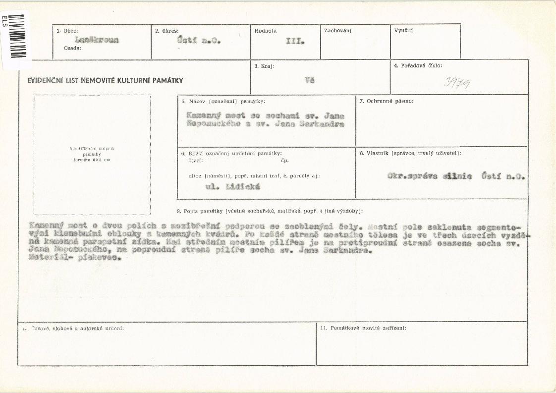 | Přír. bod: 7413 | Název objektu: socha sv. Jan Nepomucký | Část obce: Lanškroun-Vnitřní Město | Č. dom.: | Ulice: | Č. or.: | Kat. území: Lanškroun | Obec: Lanškroun | ORP: Lanškroun | Okres: Ústí nad Orlicí |