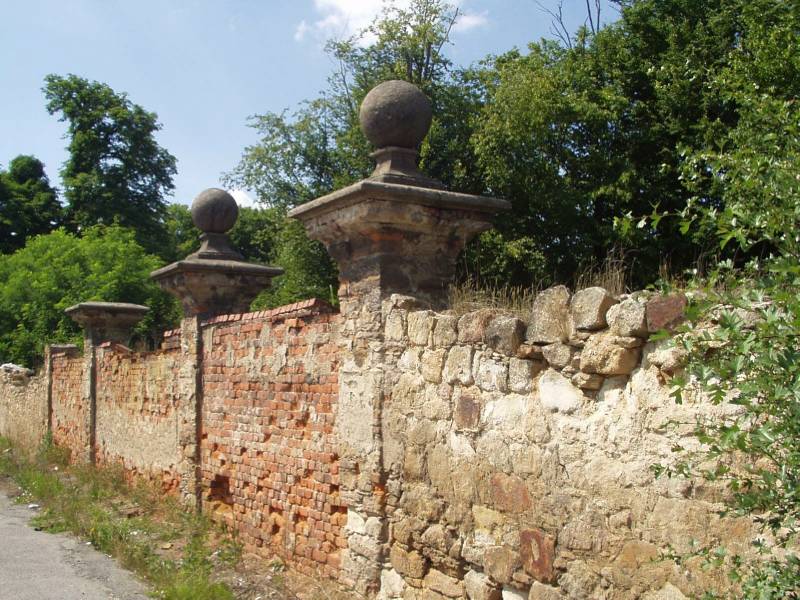 ohradní zeď parku s dekorativními prvky a putti při státní silnici