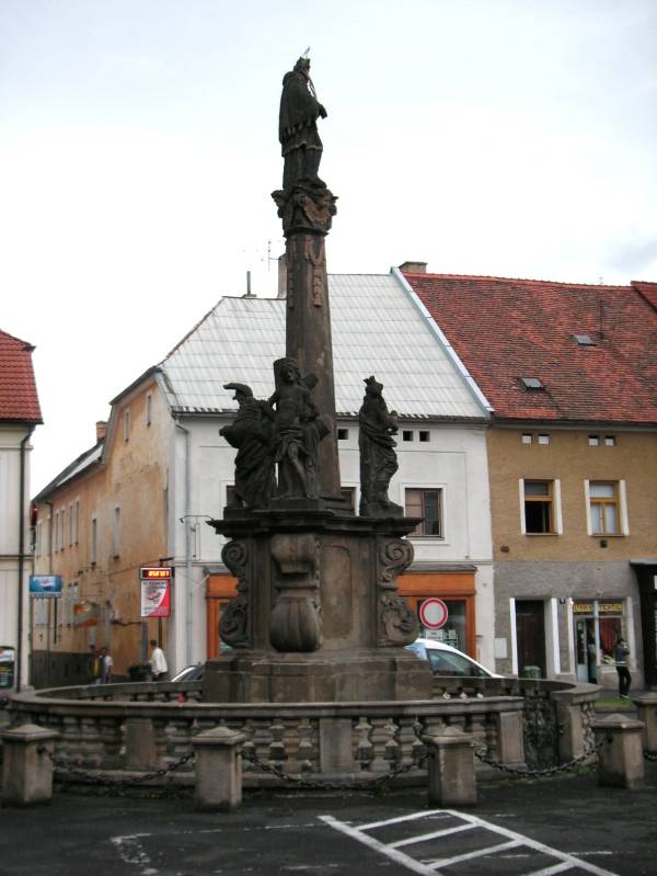 pilíř se sochou sv. Jana Nepomuckého a sochami světců